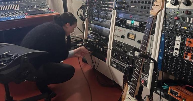 Na imagem, legendada como “Circutcircus <>”, a guitarrista aparece agachada no chão, ao lado de alguns equipamentos.