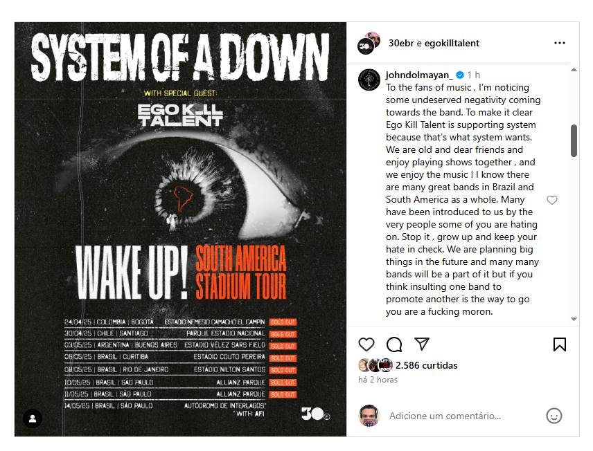 “Para os fãs de música, estou notando alguma negatividade imerecida em direção à banda. Para deixar claro, o Ego Kill Talent está abrindo para o System porque é isso que o System quer. Somos velhos e queridos amigos e gostamos de fazer shows juntos, e gostamos da música! Sei que há muitas bandas excelentes no Brasil e na América do Sul como um todo. Muitas foram apresentadas a nós pelas mesmas pessoas que alguns de vocês estão odiando. Parem com isso, cresçam e mantenham seu ódio sob controle. Estamos planejando grandes coisas no futuro e muitas bandas farão parte disso, mas se você acha que insultar uma banda para promover outra é o caminho a seguir, você é um idiota.”