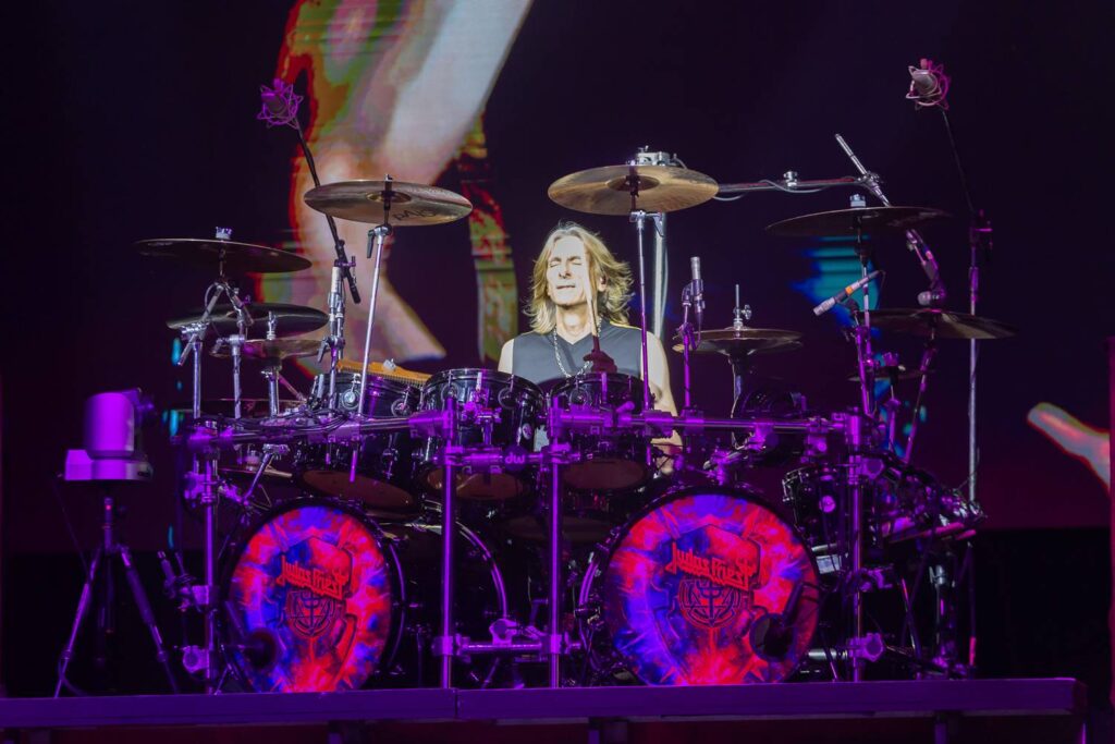 A clássica virada de bateria no meio do cover do Fleetwood Mac, imortalizada na versão ao vivo de “Unleashed in the East” (1979) pelo recém falecido Les Binks, foi tocada por Scott Travis antes de o músico ter seu momento de brilho ao fazer o público gritar por “Painkiller”. Sua introdução foi a deixa para a frenesi generalizada tomar conta da casa e, mais uma vez, Tipton surgiu nos telões enquanto Richie Faulkner reproduzia nota por nota o seu solo original.
