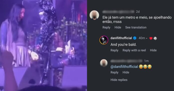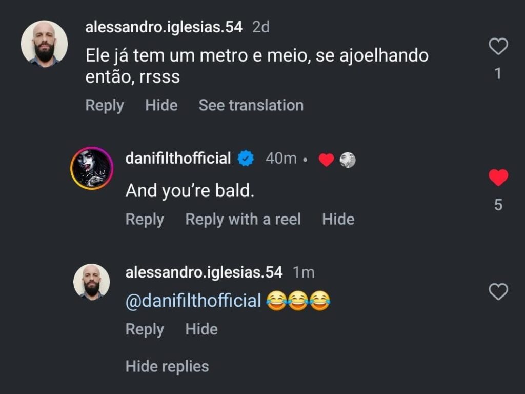 Por fim, outra pessoa também brincou: “por que o Dani se ajoelhou? Já é tão pequeno que em pé já bastava”. Numa resposta que, agora, está oculta ou foi excluída, Dani ironizou: “Uau, belo comentário, seu idiota. Continue sendo um zé-ninguém, por favor”.