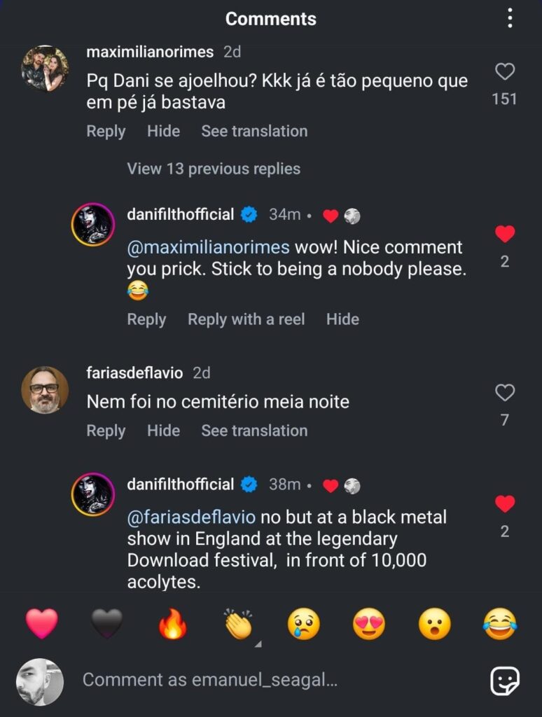 Já outro opinou: “Nem foi no cemitério meia noite”. Por sua vez, o cantor disparou: “Não, mas foi num show de black metal na Inglaterra no lendário festival Download, diante de 10 mil fãs”.