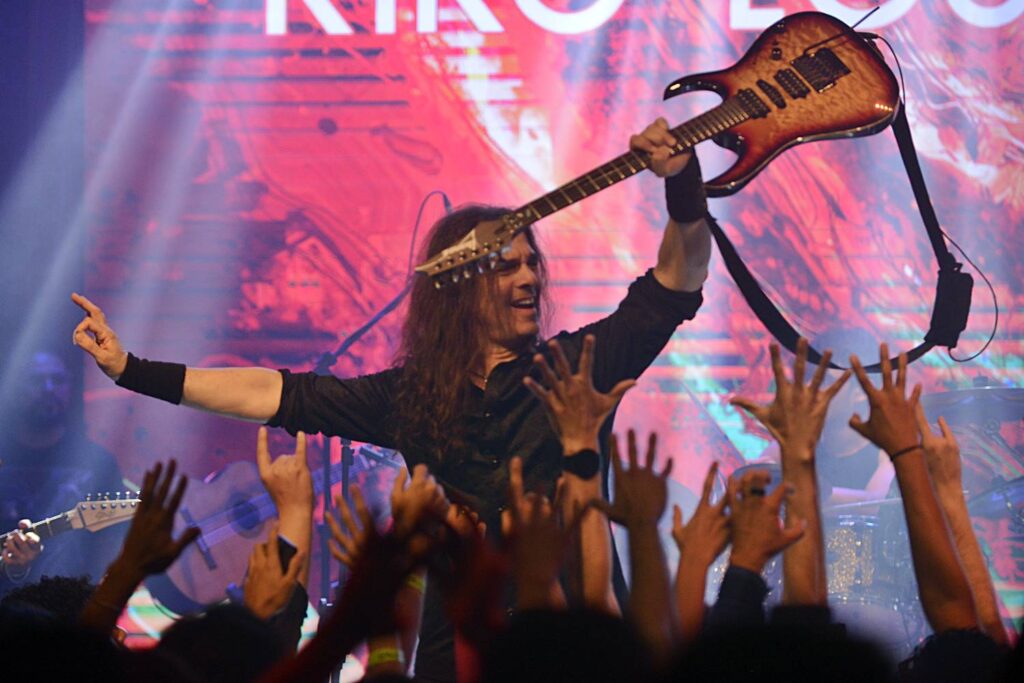 Kiko Loureiro irrompeu ao palco do Bolshoi Pub às 21h10 já solando em “Blindfolded”, após a parte climática e inicial da música ser reproduzida no som mecânico. Ela e a groovada “Mind Rise” foram as duas escolhidas para apresentar seu novo trabalho de estúdio, o primeiro após saída do Megadeth em novembro de 2023.