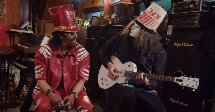 A figura de Buckethead é uma das mais curiosas do mundo da música. O virtuoso e produtivo guitarrista com uma máscara sem expressão e um balde de frango na cabeça já fez parte até do Guns N’ Roses. Por nunca falar, raramente dá entrevistas, mas topou “conversar” — entre aspas mesmo — ao lado do veterano e parceiro Bootsy Collins.