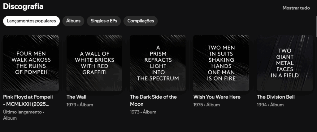 A discografia do Pink Floyd passou por uma notória mudança nas plataformas digitais na última segunda-feira (9). Em streamings como Spotify, Deezer e Apple Music, todos os álbuns da banda estão sem as capas originais e, em substituição, ganharam fundos pretos descrevendo as imagens.