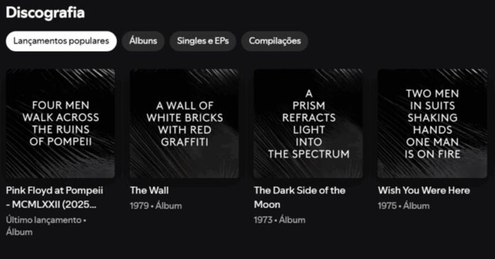 A discografia do Pink Floyd passou por uma notória mudança nas plataformas digitais na última segunda-feira (9). Em streamings como Spotify, Deezer e Apple Music, todos os álbuns da banda estão sem as capas originais e, em substituição, ganharam fundos pretos descrevendo as imagens.