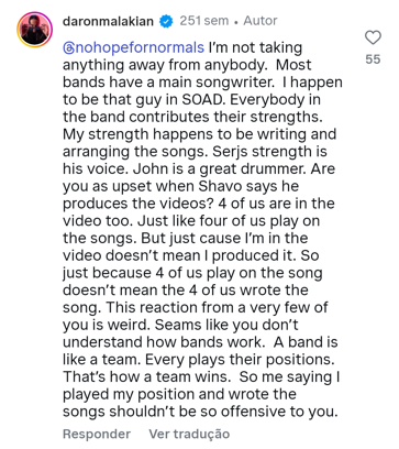 “Não estou tirando o mérito de ninguém. A maioria das bandas tem um compositor principal. No caso do SOAD, essa é a minha função. Todo mundo na banda contribui com seus pontos fortes. O meu é compor e arranjar as músicas. O ponto forte do Serj é a voz dele. O John é um ótimo baterista. Vocês ficam chateados quando o Shavo diz que produz os vídeos? Todos nós aparecemos nos vídeos. Assim como todos nós tocamos nas músicas. Mas só porque eu apareço no vídeo não significa que eu o produzi. Da mesma forma, só porque todos nós tocamos em uma música não significa que os quatro compuseram a música. A reação de alguns de vocês é estranha. Parece que não entendem como uma banda funciona. Uma banda é como um time. Cada um desempenha sua função. É assim que um time vence. Então, eu dizer que desempenhei meu papel e compus as músicas não deveria ser tão ofensivo para vocês.”
