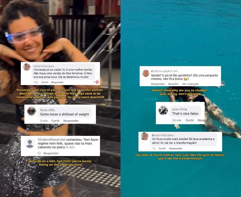 Entre os ataques, havia comentários como: “Vegana e só ganhando peso”, “Quando começa a dieta?”, “E é gorda, imagina se comesse carne” e “Tem que fazer regime, hein, Fefe, quase não tá cabendo mais no palco”. Uma das mensagens ainda possivelmente fazia referência a Max Cavalera, afirmando: “Fernanda, só se cuida! Você é uma mulher bonita. Não vire uma versão feminina do Max. Ele era boa pinta quando jovem, mas se deteriorou muito.”