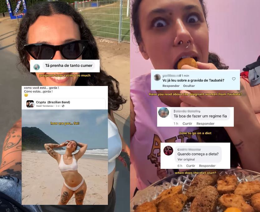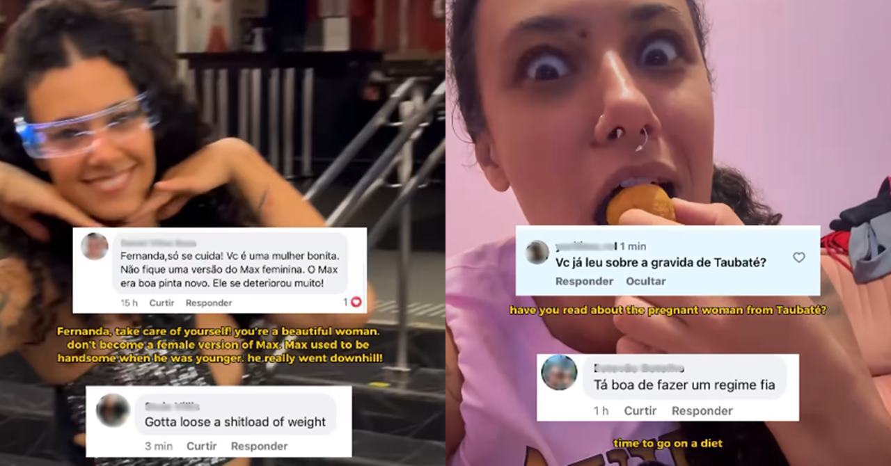 “Vivemos uma era em que se vende ‘bem-estar’ como disfarce pro culto à estética. Pessoas com procedimentos, hormônios, remédios, com corpos cada vez mais inatingíveis, porém tratadas como referência de naturalidade, reforçam a mensagem de que você não é suficiente, pra vender publicidade. Isso sem contar o patriarcado usando isso como ferramenta para desestruturar mulheres incríveis. Não, não sou uma pessoa gorda e mesmo assim recebo esse tipo de comentário, e me dói pensar pelo que pessoas gordas ou muito magras passam. E o mais triste é ver uma epidemia de pessoas infelizes consigo mesmas. Conheço pessoas gordas que sofrem pra secar a barriga, e pessoas magras que vivem presas à balança, querendo mais músculo, mais bunda, mais peito.”