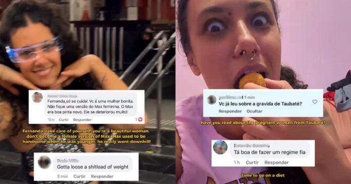 “Sim, eu comecei a receber comentários gordofóbicos. Eles não me atingem porque tô com a terapia em dia, mas quero que saibam que eles existem e também provocar uma reflexão. Eu sofri bullying minha infância e adolescência inteira por ser ‘esquelética’, hoje tenho quase 40 anos e meu metabolismo não é mais o mesmo, minha vida na estrada (onde passo maior parte do ano) é desregrada, muitas vezes fast food é a única opção, não durmo direito, e é quase que impossível manter minha rotina de exercícios, porém estou bem e com a saúde em dia. Já nos meus vídeos mais esbeltos desse reels era quando eu não estava nada bem, me recuperando de traumas que me fizeram ter vontade de desistir da vida. Entendem como o corpo é relativo? A gente precisa lembrar que por trás de qualquer corpo existem fatores genéticos, psicológicos, sociais, ritmos de vida e metabolismos diferentes.”