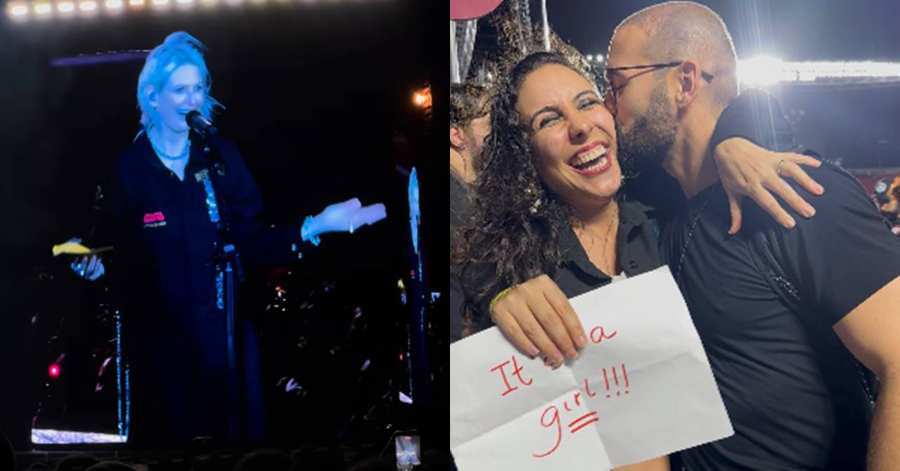 Em seguida, a vocalista Emily Armstrong recebeu o envelope com a resposta, brincando que “estava mais nervosa” do que a futura mãe. Com pedidos de um rufar de bateria para Colin Brittain e certo mistério, a cantora finalmente anunciou que seria uma menina e parabenizou a admiradora enquanto o estádio ganhava uma iluminação rosa.