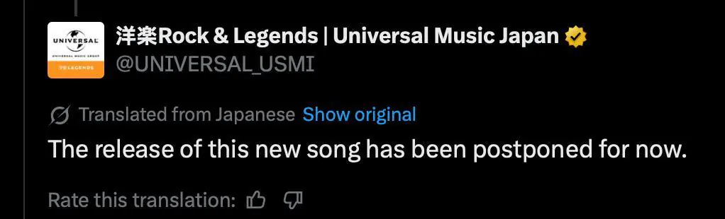 Até o momento, a banda não emitiu nenhum pronunciamento a respeito. Por sua vez, um perfil oficial da gravadora Universal Music Japan no X/Twitter não deixou a situação passar em branco e publicou que “o lançamento foi adiado por enquanto” (via Axl Rose Fã Clube):