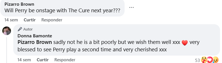 “Infelizmente, ele não está muito bem, mas desejamos o melhor à banda. Sou muito grata por ter visto Perry tocar com The Cure segunda vez, foi um momento muito especial e precioso.”