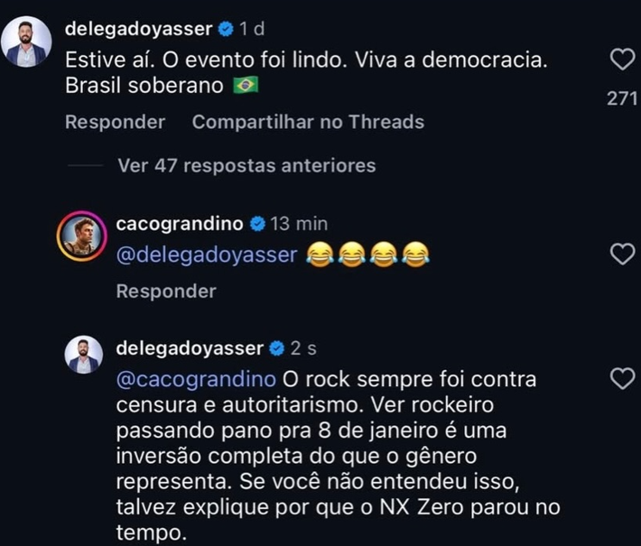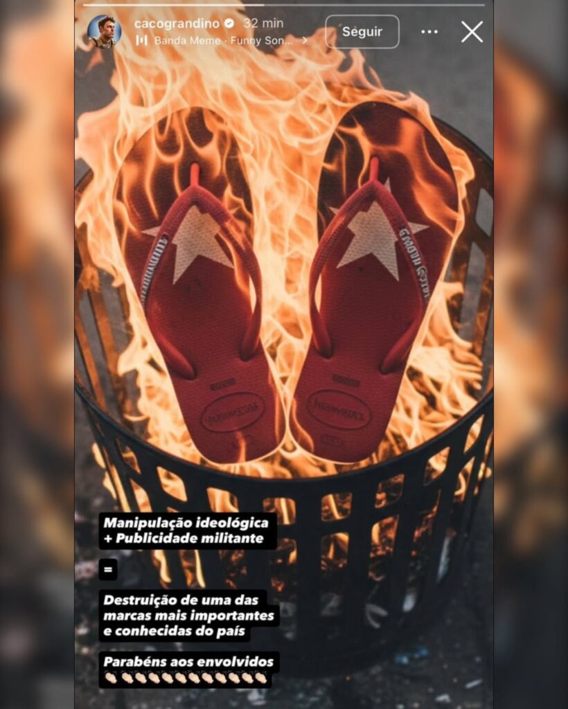 Internautas também resgataram outras publicações de Caco, que segue nomes como o deputado Nikolas Ferreira e a família Bolsonaro. Em um Story datado de dezembro, o baixista chamou de “manipulação ideológica” e “publicidade militante” a propaganda da Havaianas na qual a atriz Fernanda Torres fala para que o público comece o ano não com o pé direito, mas com os dois pés — frase que gerou revolta na direita.