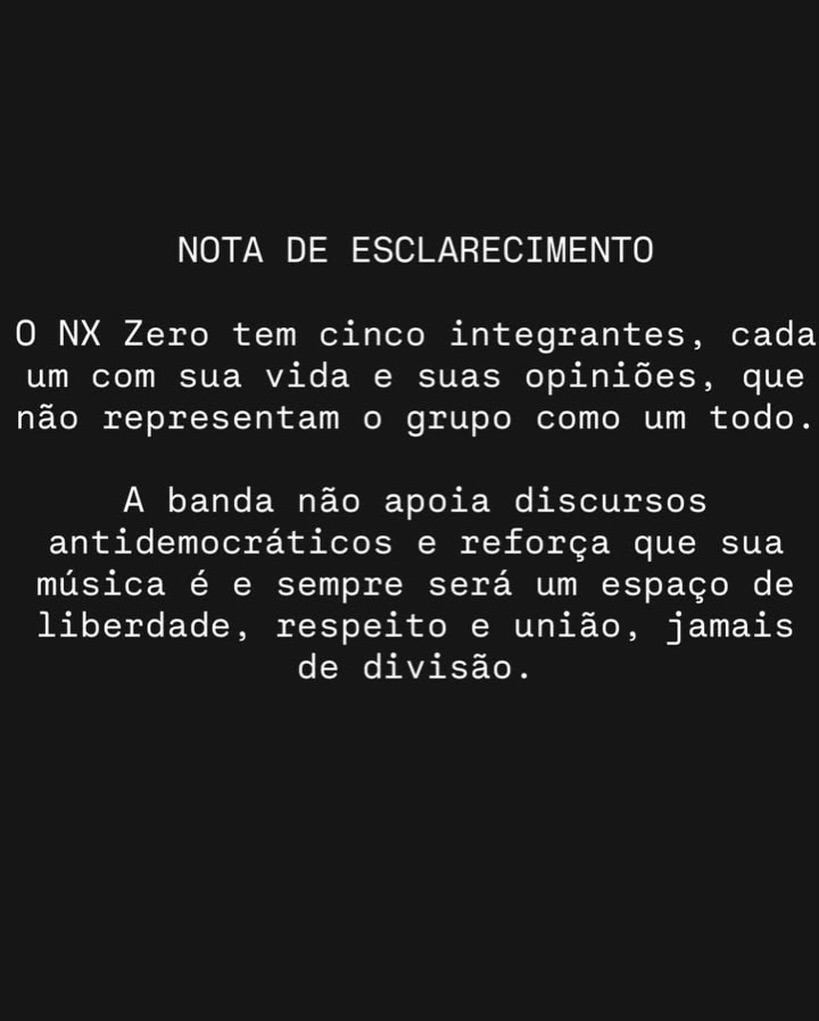 “O NX Zero tem cinco integrantes, cada um com sua vida e suas opiniões, que não representam o grupo como um todo. A banda não apoia discursos antidemocráticos e reforça que sua música é e sempre será um espaço de liberdade, respeito e união, jamais de divisão.”