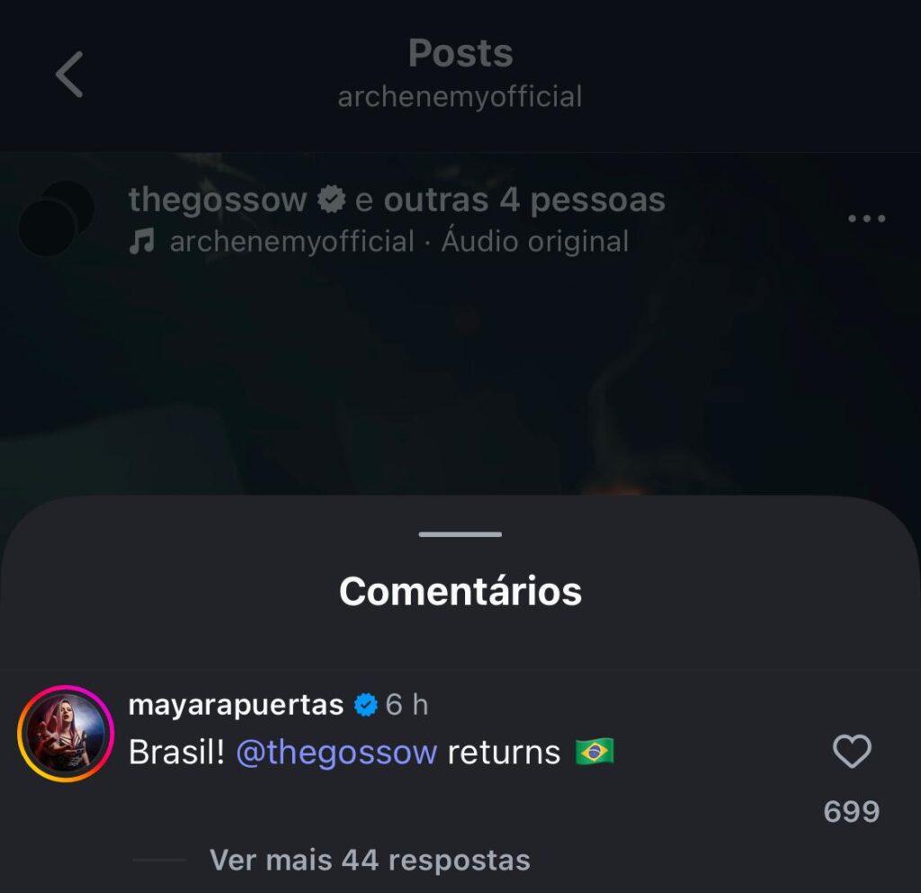 Entre os muitos comentários, Puertas surgiu na postagem anunciando aos brasileiros que Angela Gossow está de volta, ao dizer: “Brasil! Angela Gossow retorna”. A própria Mayara foi sugerida como possível nova vocalista do Arch Enemy nos últimos dias, quando a banda foi revelada como headliner do festival Bangers Open Air, substituindo o Twisted Sister — e não havia negado os boatos desde então.
