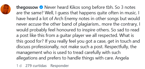“Nunca tinha ouvido a música do Kiko Loureiro antes, para ser sincera. Então são três notas iguais? Bem, acho que isso acontece com bastante frequência na música. Já ouvi muitas notas do Arch Enemy em outras músicas, mas nunca acusaria outra banda de plágio… muito pelo contrário, provavelmente me sentiria honrada em inspirar outros. É muito triste ler um post assim de um guitarrista que todos nós respeitávamos. Qual o intuito disso? Se você realmente acha que é um caso [de plágio], entre em contato e resolva isso de forma profissional, em vez de fazer esse tipo de publicação. Respeitosamente, a equipe de gestão está acostumada a lidar com esse tipo de acusação com cautela e prefere tratar essas questões com cuidado.”