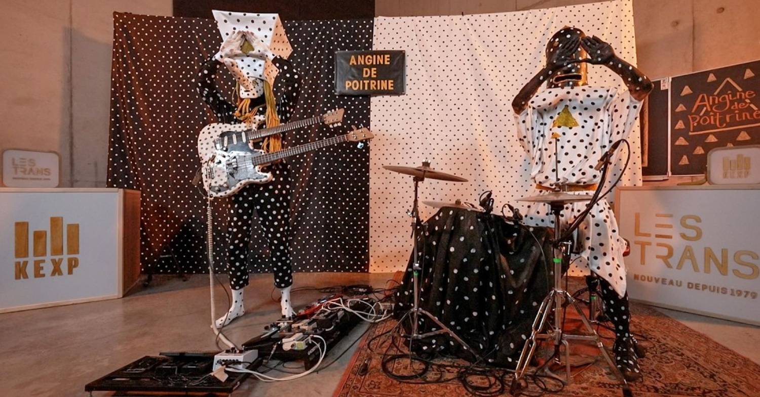 Um duo chamado Angine de Poitrine recentemente viralizou na internet. Formada em 2024 em Quebec, no Canadá, a dupla composta por Khn de Poitrine (guitarras) e Klek de Poitrine (bateria) vem chamando atenção não só pela sonoridade experimental, mas também pelo visual, com os integrantes vestindo máscaras de papel machê e roupas com bolinhas.