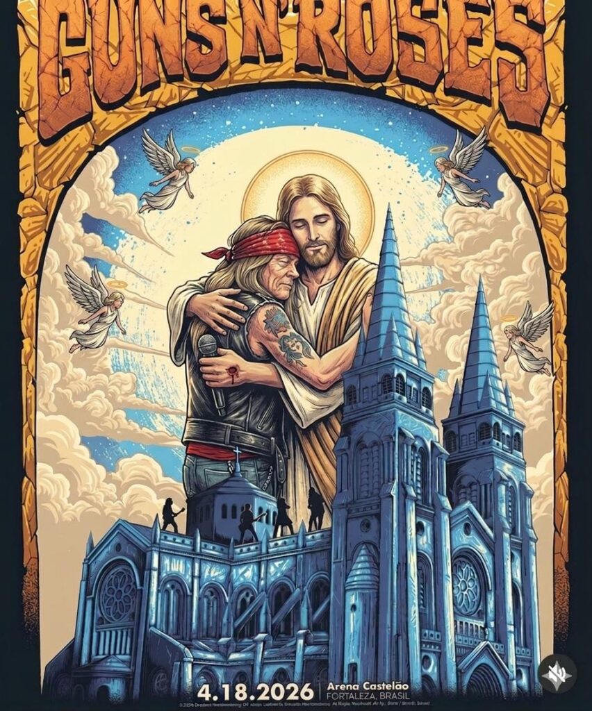 Especificamente o cartaz do show na Arena Castelão, no Ceará, no último sábado (18), gerou polêmica. Isso porque a ilustração mostra a Catedral Metropolitana de Fortaleza sendo abraçada por uma espécie de monstro vermelho, semelhante ao da capa original de “Appetite for Destruction” (1987), o que causou desconforto na Arquidiocese de Fortaleza.