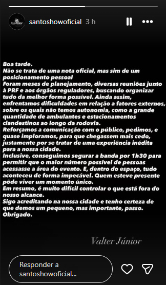Com a repercussão dos acontecimentos, a produtora responsável pela apresentação emitiu uma nota nas redes sociais. Valter Júnior, da Santo Show, primeiramente escreveu nos Stories do Instagram (via RockBizz):