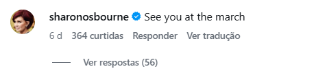 Sharon Osbourne deverá marcar presença em uma marcha anti-imigração. Por meio das redes sociais, a empresária e viúva de Ozzy Osbourne sugeriu que estará em ato organizado pelo ativista britânico de direita Tommy Robinson, conhecido por protestos contra imigrantes em Londres, na Inglaterra.